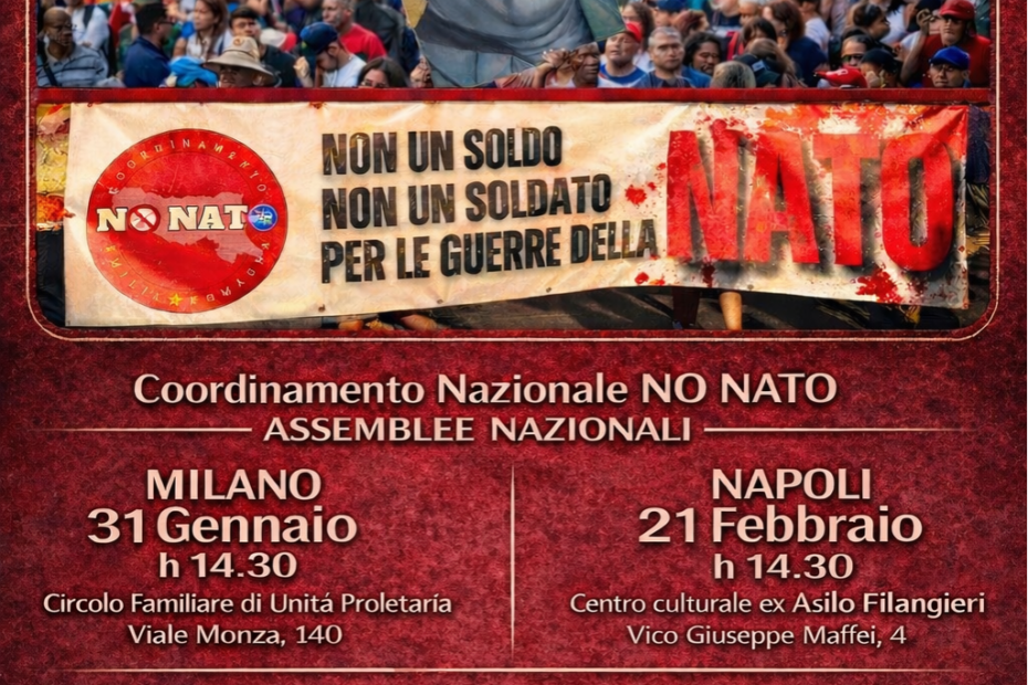 Bilancio e prospettive della più generale lotta per fermare la Terza guerra mondiale Milano, 31 gennaio 2026, ore 14.30: Circolo Familiare di Unità Proletaria, viale Monza n.140 Napoli, 21 febbraio 2026, ore 14.30: Circolo culturale ex Asilo Filangieri, vico G. Maffei n.4 Il 2025 è stato un anno di grandi e significativi passi avanti nella lotta per farla finita con… Leggi tutto »31 GENNAIO E 21 FEBBRAIO: ASSEMBLEE NAZIONALI DEL COORDINAMENTO NAZIONALE NO NATO