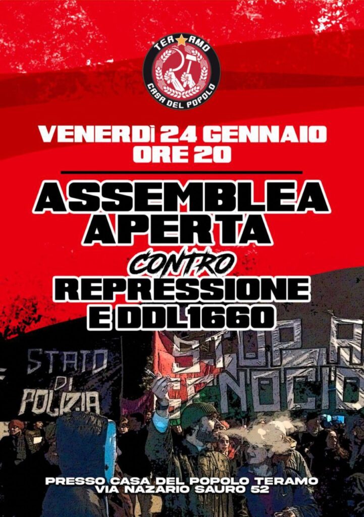 Per questo invitiamo tutte e tutti all’Assemblea pubblica del 24 gennaio, questo venerdì, alla Casa del Popolo di Teramo