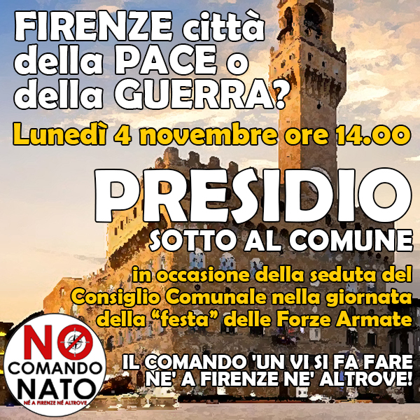Non ci fermeremo finché Firenze non sarà realmente città di pace e quindi senza nessun comando NATO, finché le alte città e il resto del paese non seguano questo esempio e caccino la NATO, i sionisti e i guerrafondai di ogni tipo!