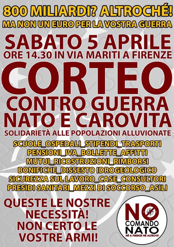Scendiamo in piazza per dire che non saremo carne da cannone, che Firenze non è zona di guerra e non vuole il Comando NATO.